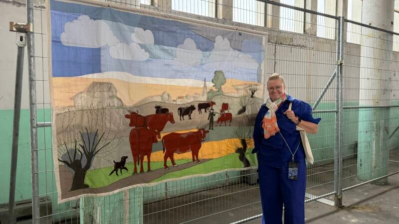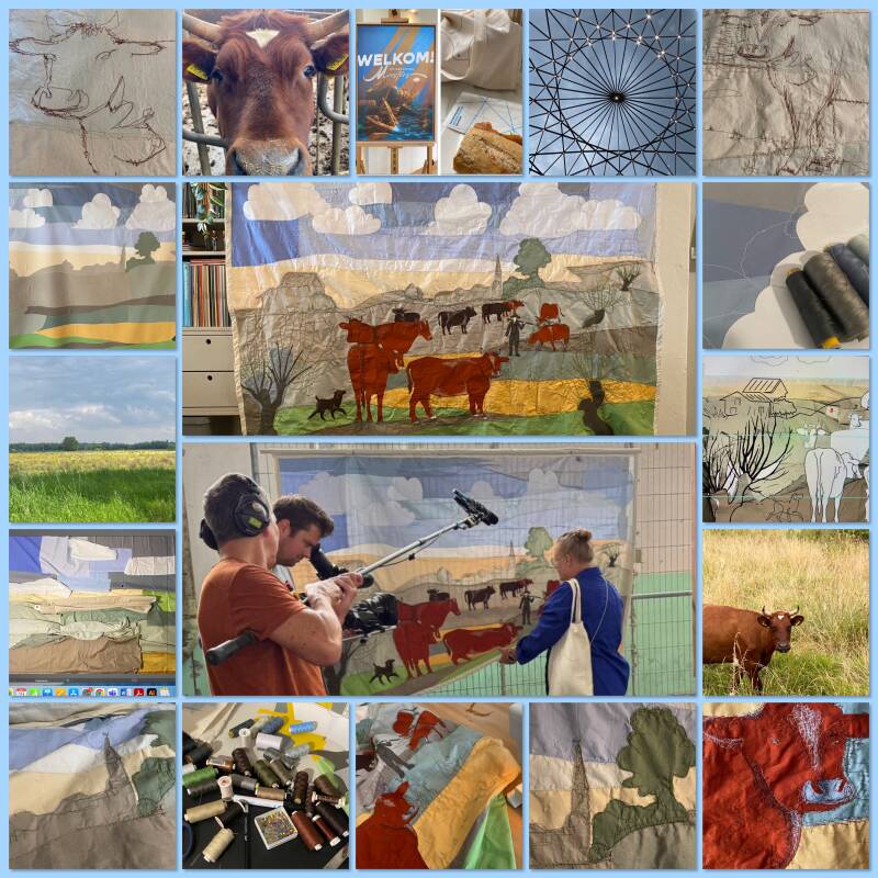 Mijn vertaling van "de Groote Ossedrift van Paulus Potter" uitgewerkt in textiel en getekend met de naaimachine. Als Ossenaar natuurlijk extra mooi om een stukje geschiedenis erin te verwerken. De tien ossen worden door de boer en de hond weggedreven richting rivier de Maas. In de verte zie je het dorp Macharen met helder daglicht en een echte Hollandse lucht.